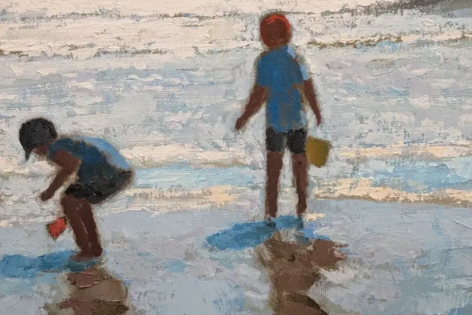 Regarde ! Huile sur toile 50 x 150 cm Magie de l’eau et des oiseaux, découverte de coquillages nacrés, l’émerveillement et les rires lorsque les… Read More »Regarde !